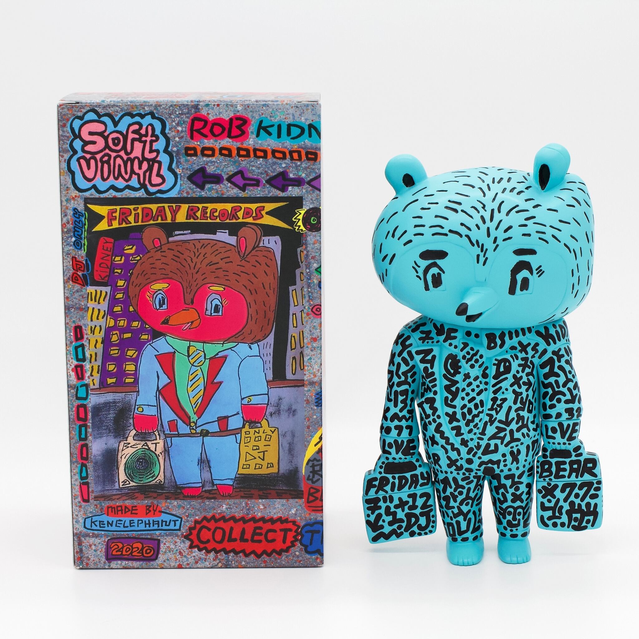 Hand-painted one-off art piece - Soft vinyl figure of ‘FRIDAY BEAR,’ an original character created by British artist Rob Kidney.