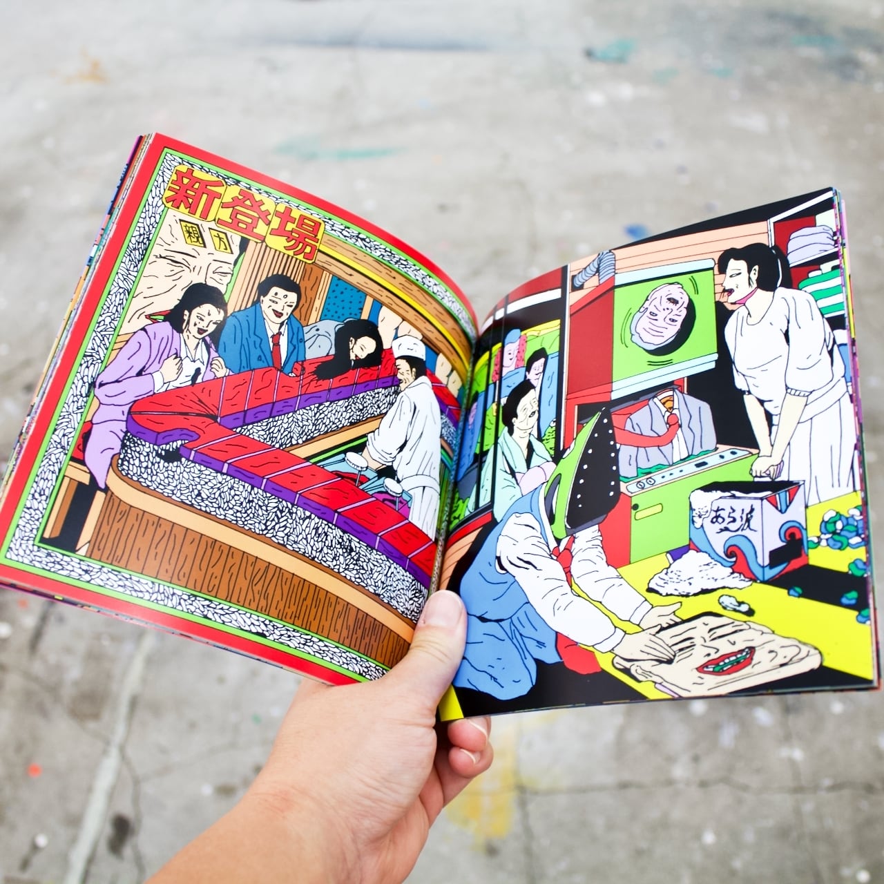 松田の作品には、時代や地域を超えたあらゆる者が集まり、現実と非日常が混在する不条理な社会が広がっています。バブル期のサラリーマンやOL、ギャルなど、昭和~平成の憧憬をブラックユーモアたっぷりに現代に置き換え、モラルや秩序から解放された遊戯的な未来世界を描き出します。