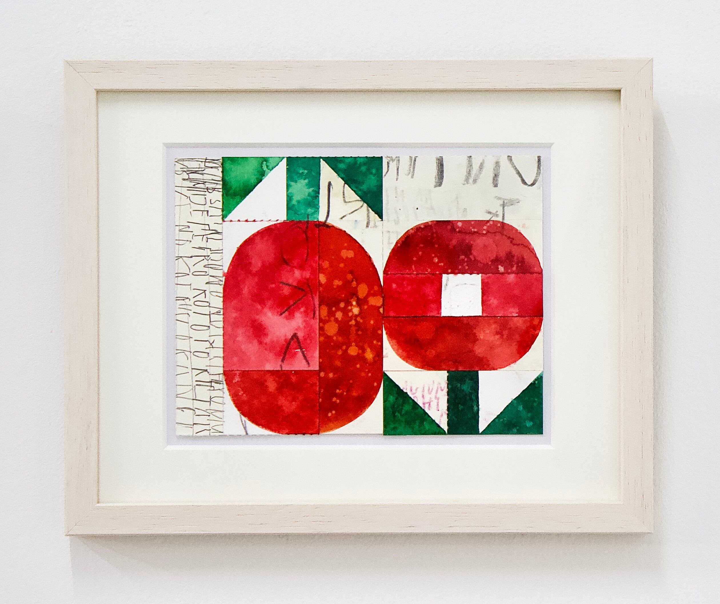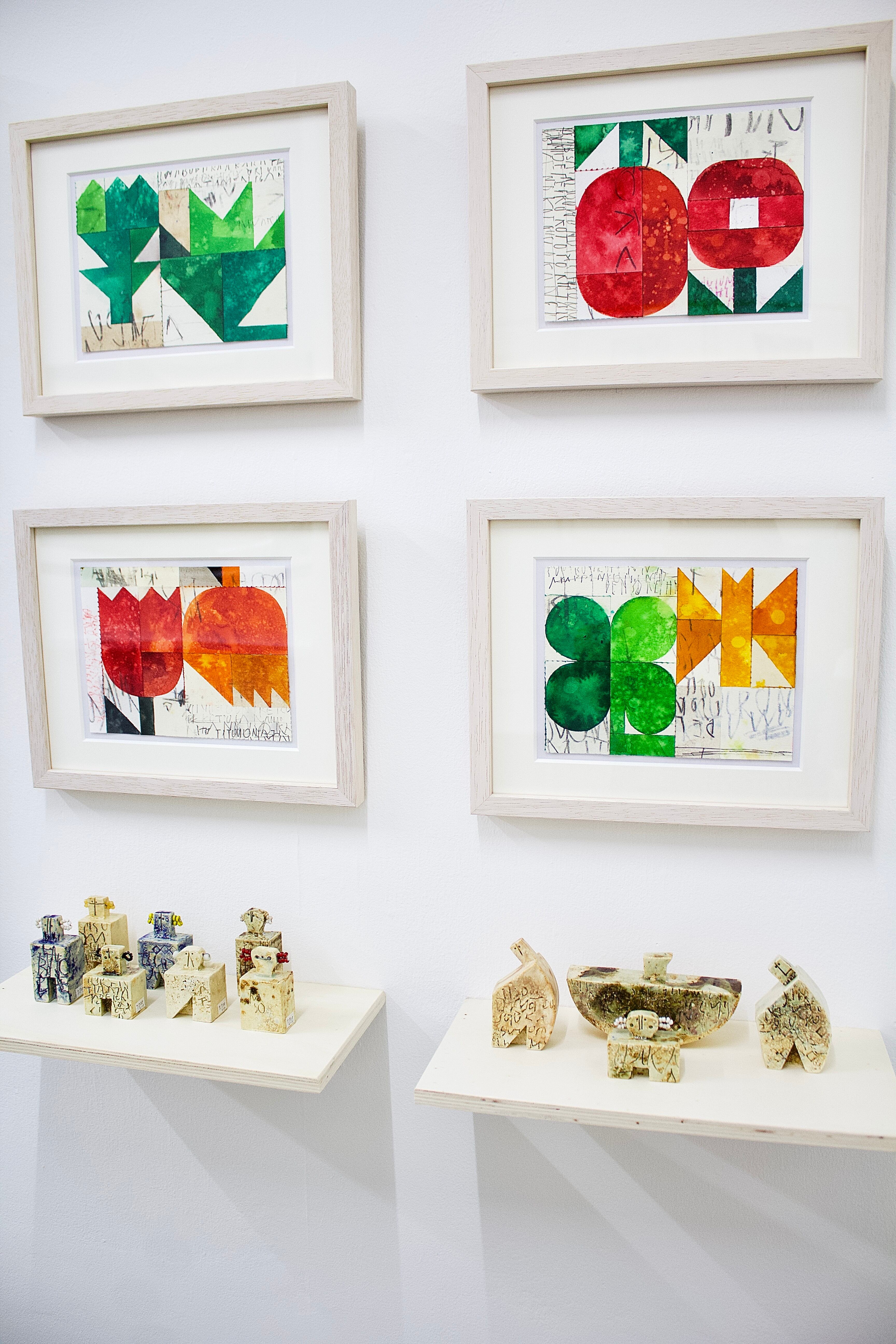 Using watercolour and collage techniques, he creates symbolic and rhythmic works incorporating simple forms and repetitive elements.