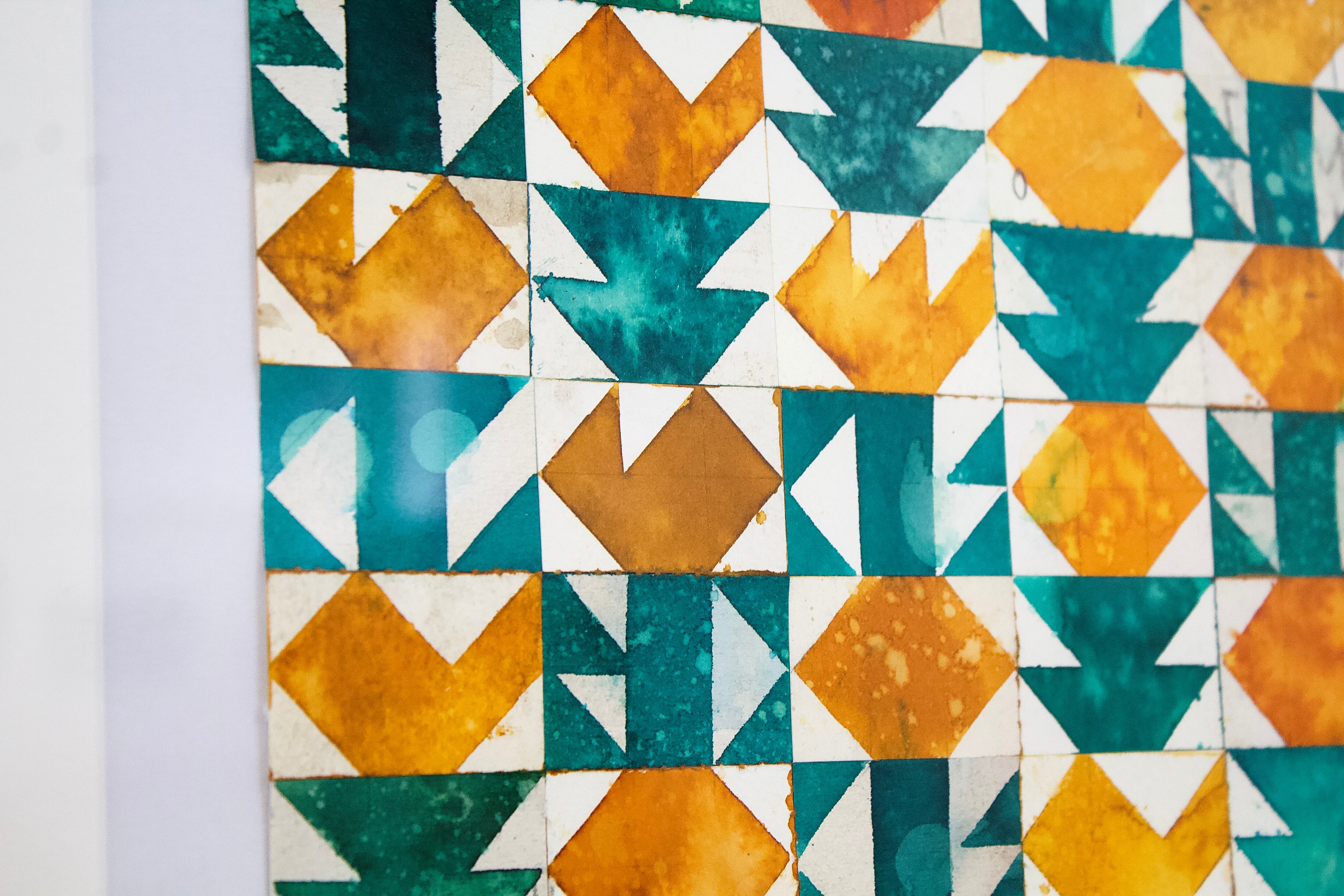 Using watercolour and collage techniques, he creates symbolic and rhythmic works incorporating simple forms and repetitive elements.