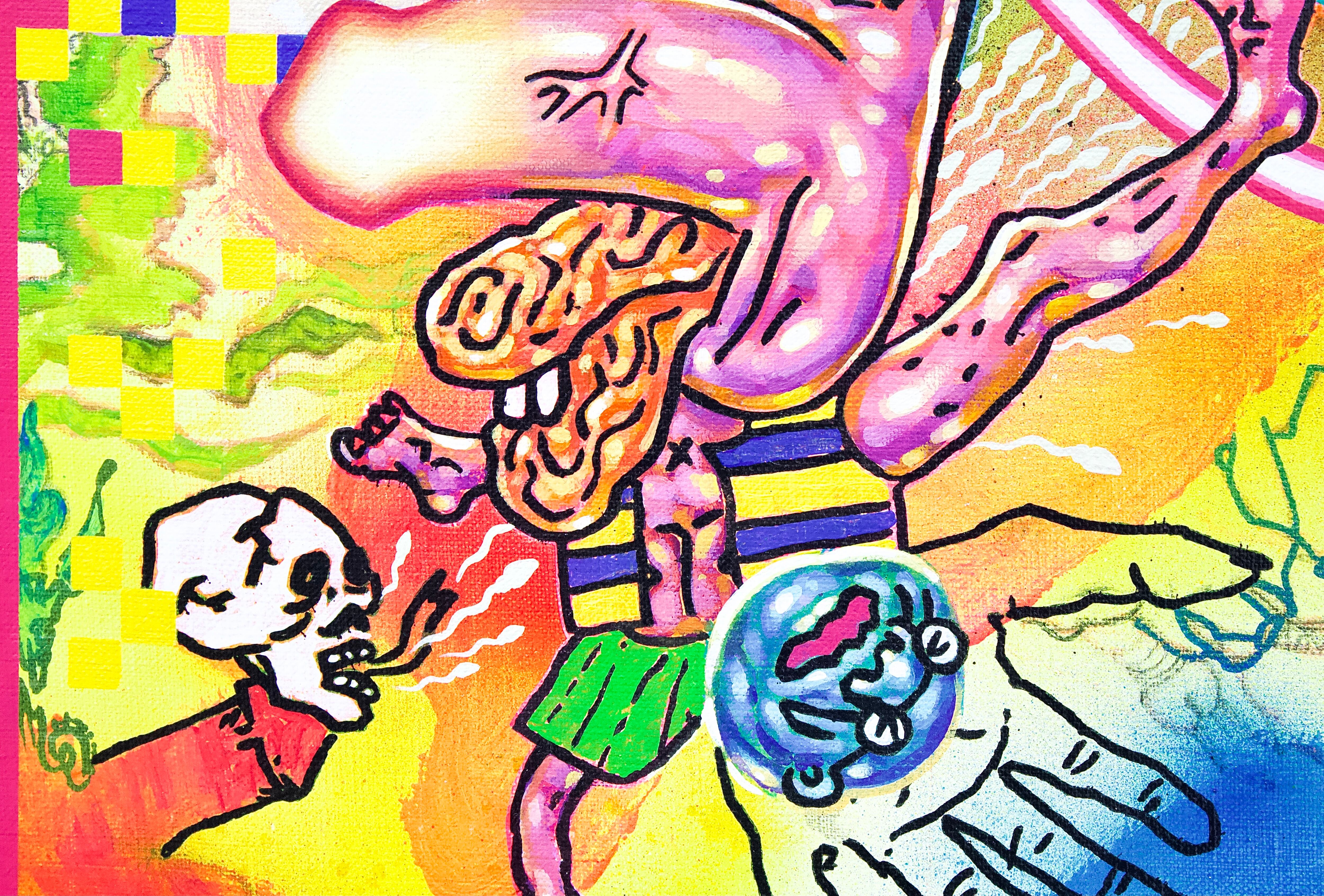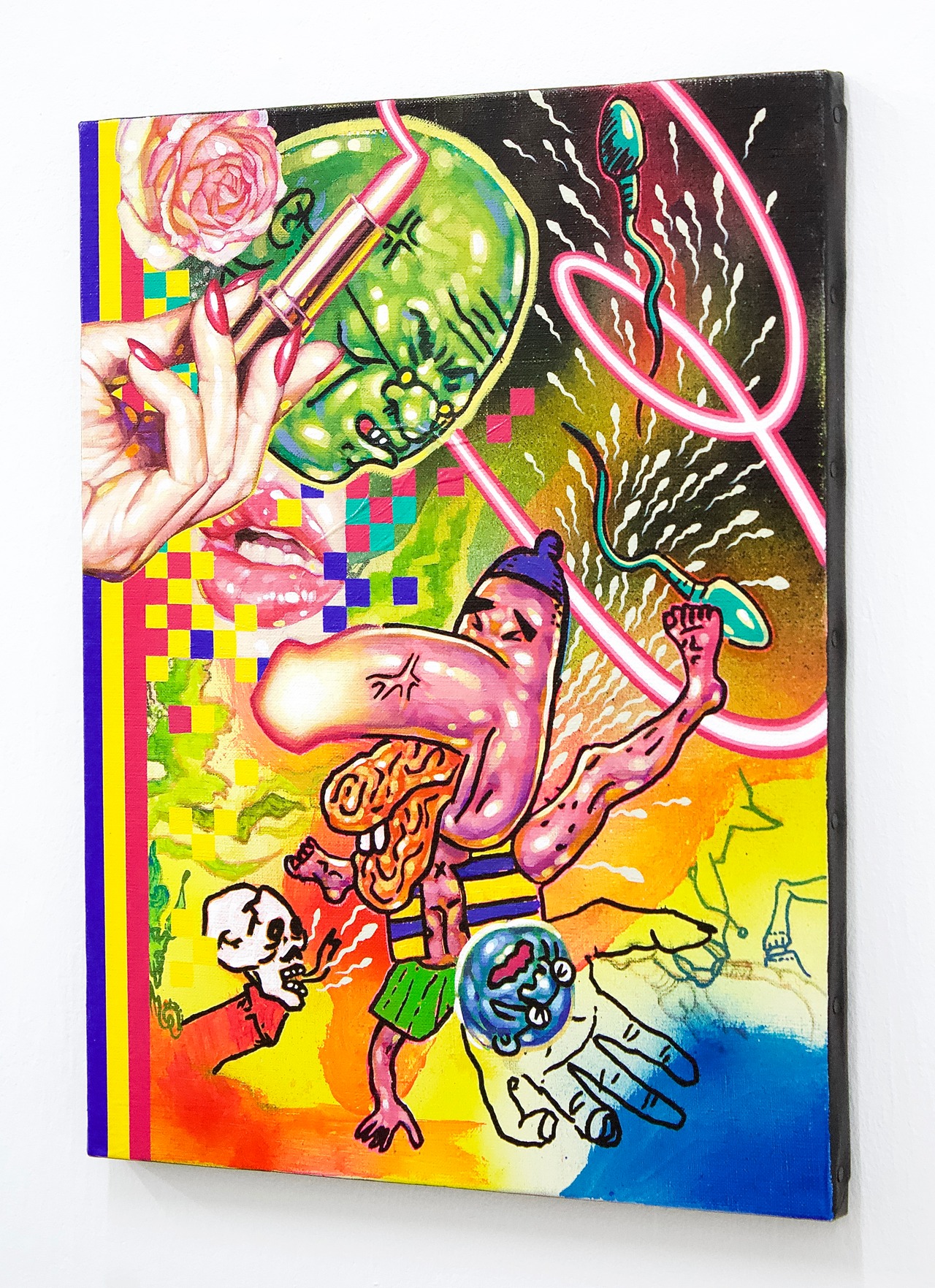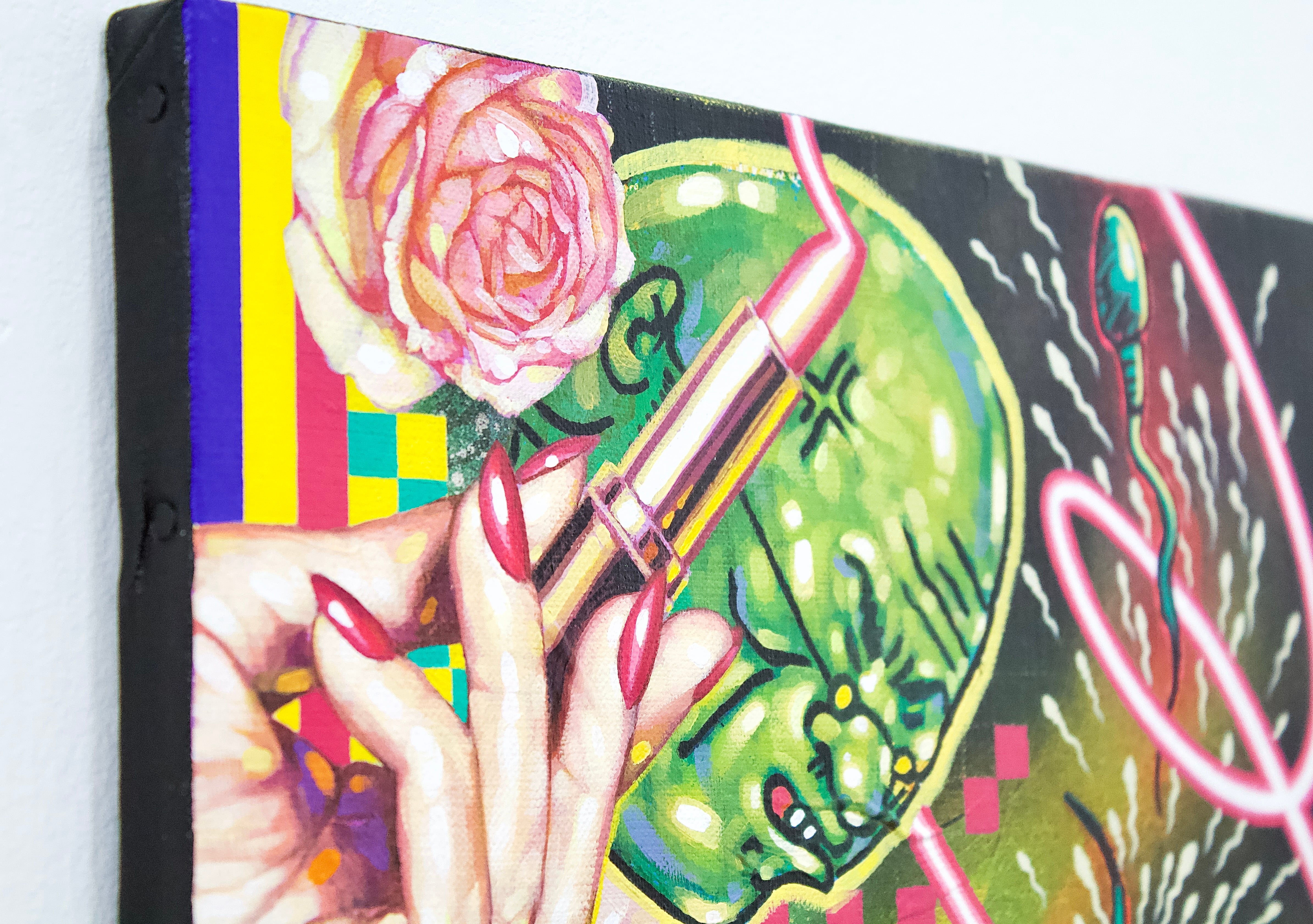 A collaborative original painting by Japanese subculture as an avant-garde manga artist Takashi Nemoto and the unorthodox style of realism painter Ken Hamaguchi.