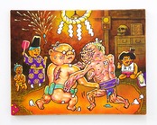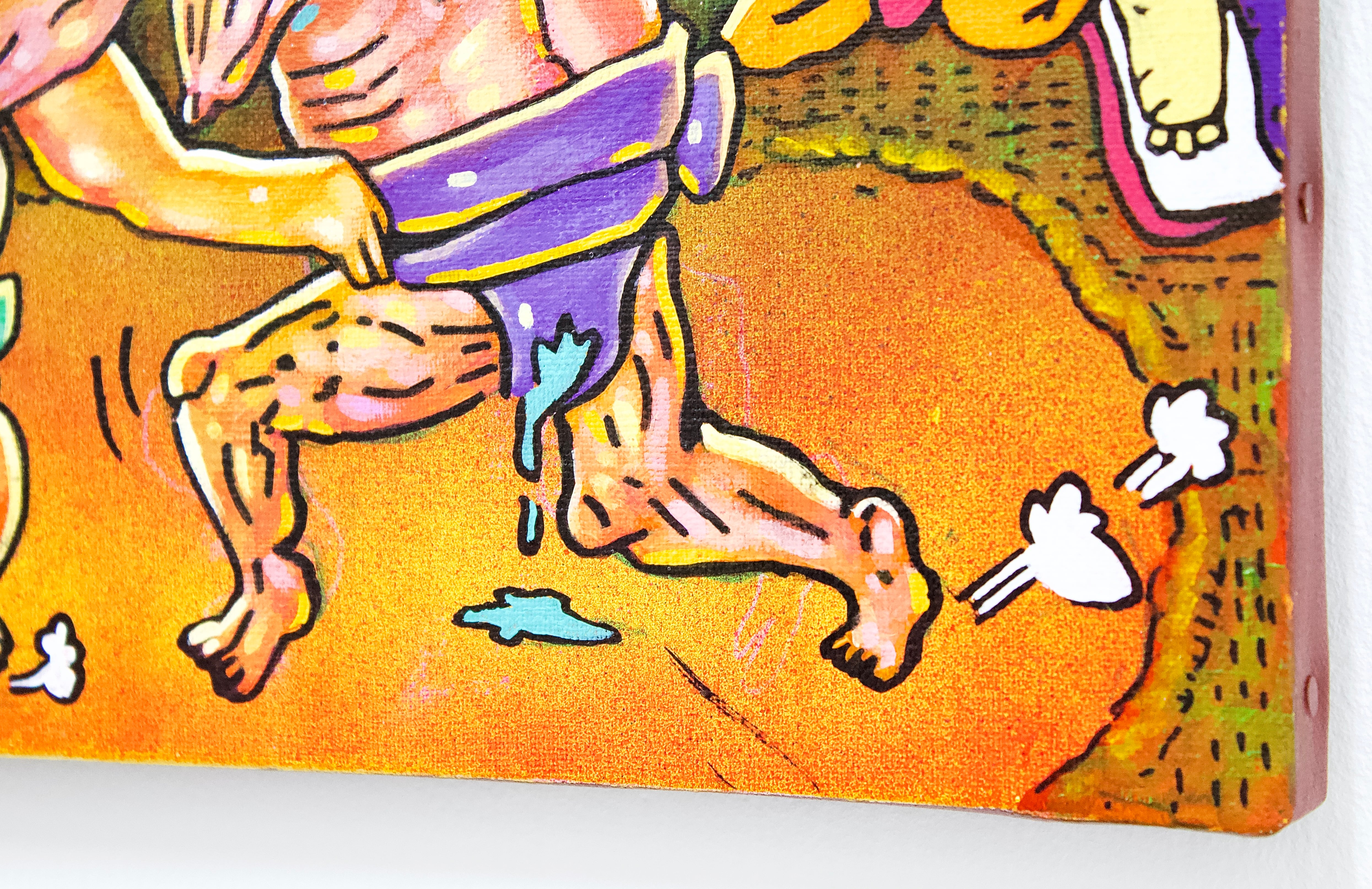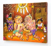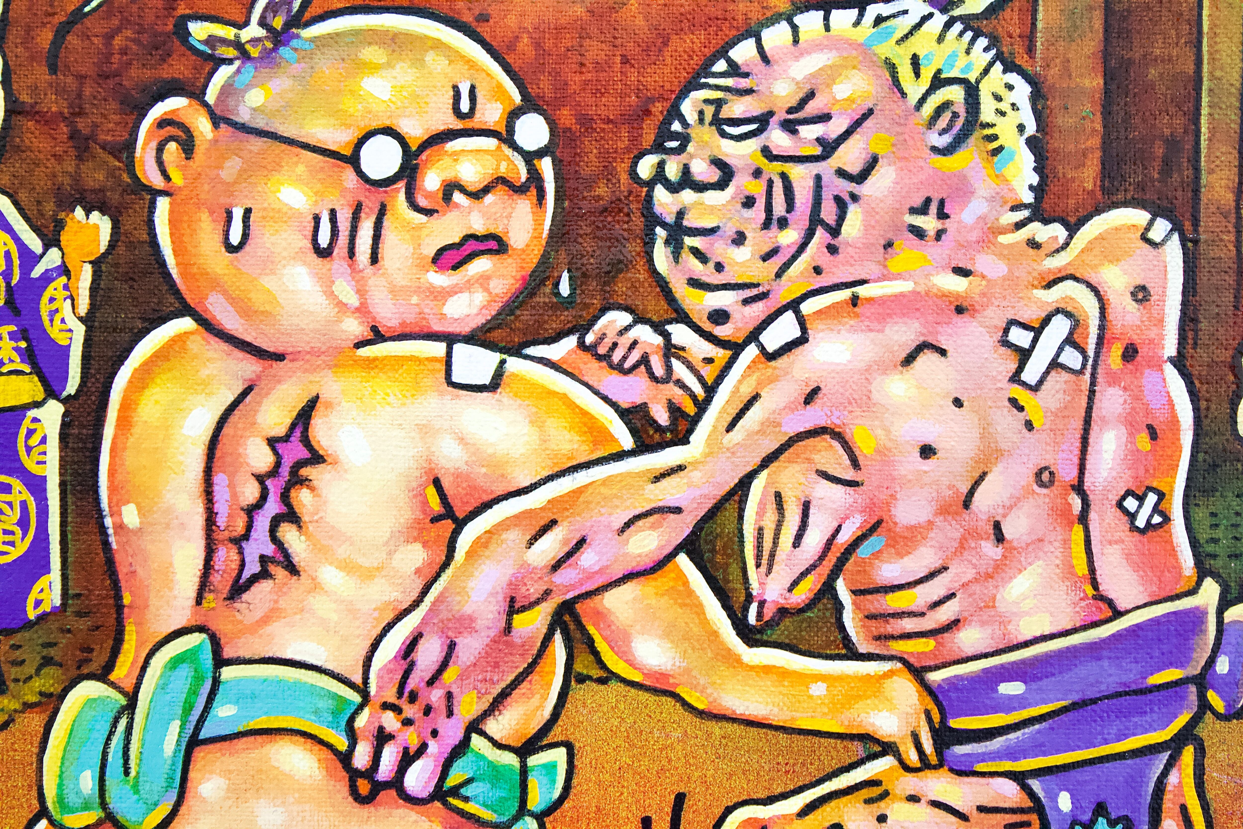 A collaborative original painting by Japanese subculture as an avant-garde manga artist Takashi Nemoto and the unorthodox style of realism painter Ken Hamaguchi.